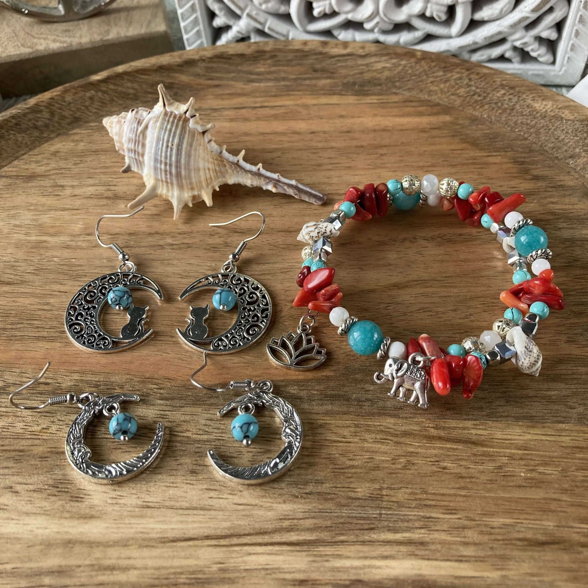 Ces boucles d’oreilles lune et chat en imitation turquoise sont idéales pour celles qui aiment les bijoux colorés et gais.