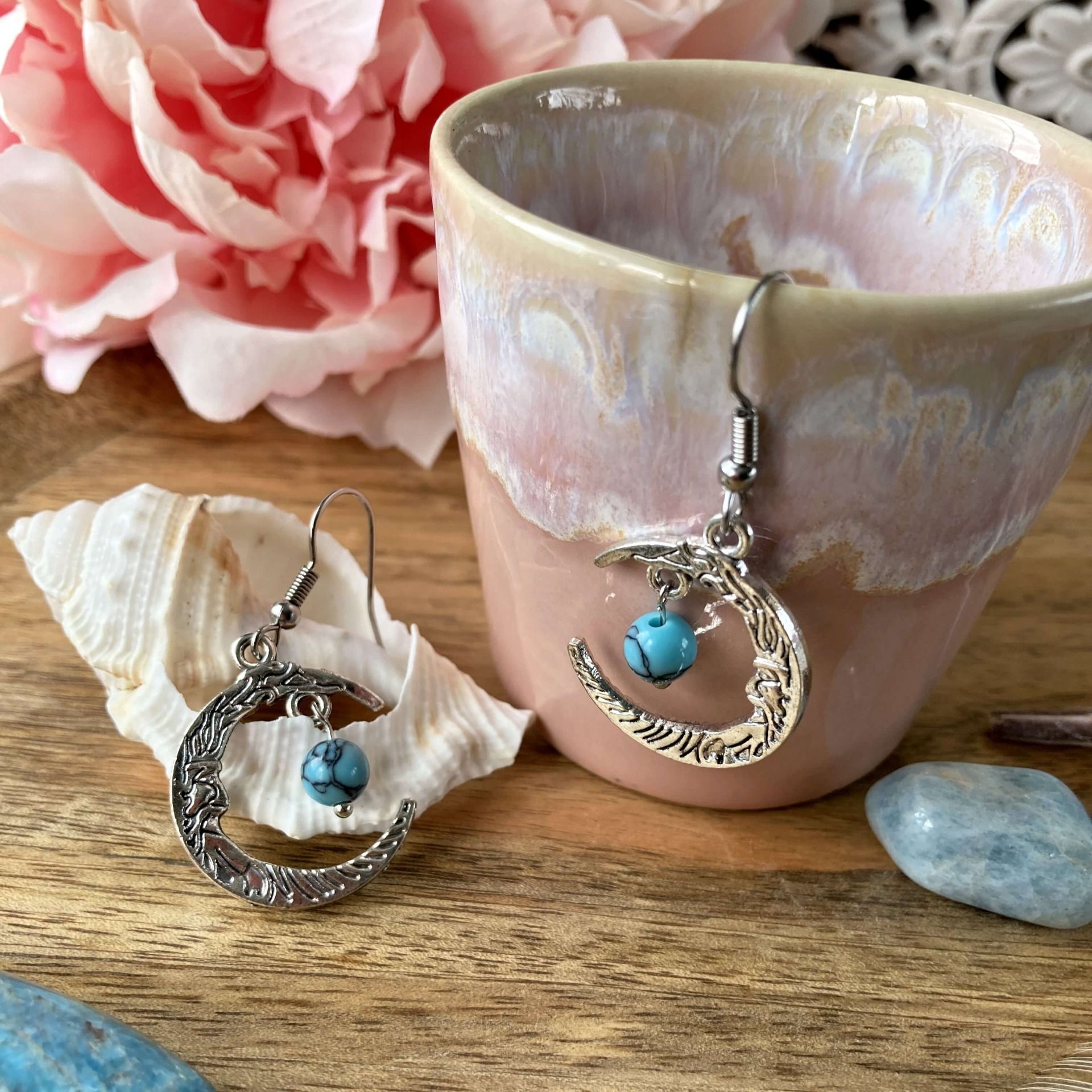Boucles d’oreilles Lune ou Lune Chat, imitation Turquoise