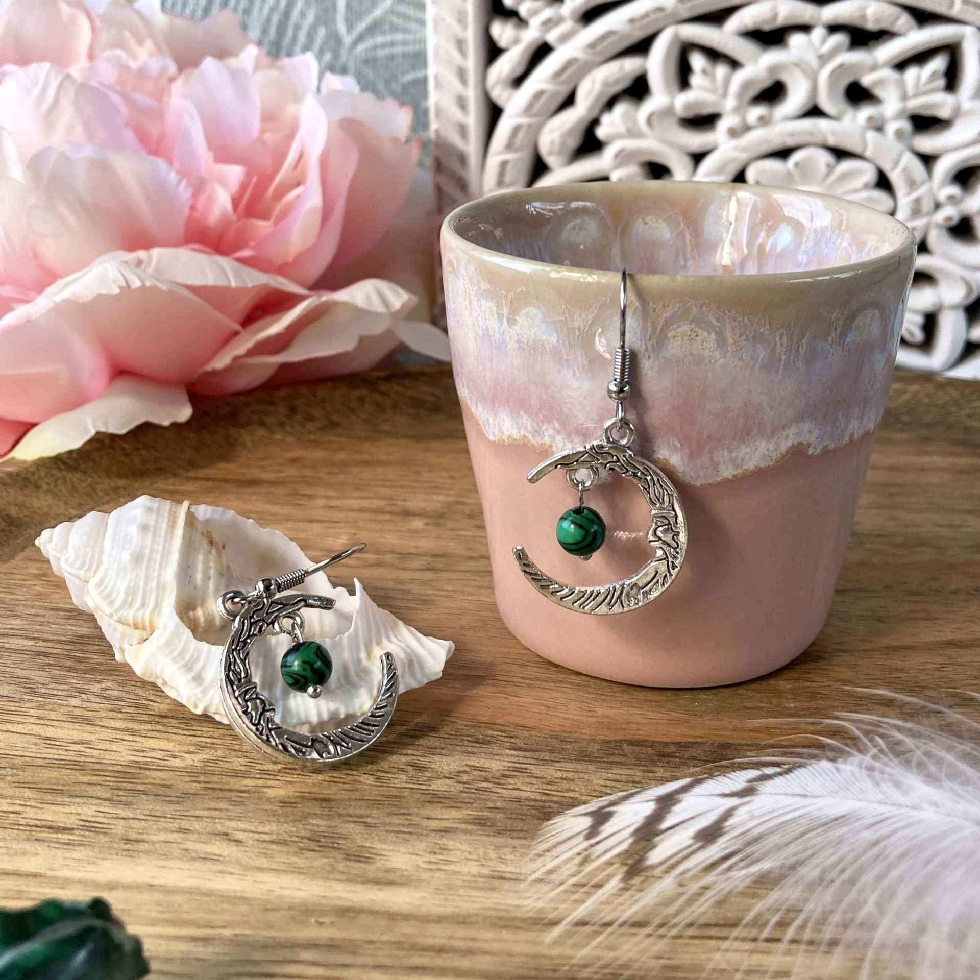 Boucles d’oreilles Lune ou Lune Chat, Malachite