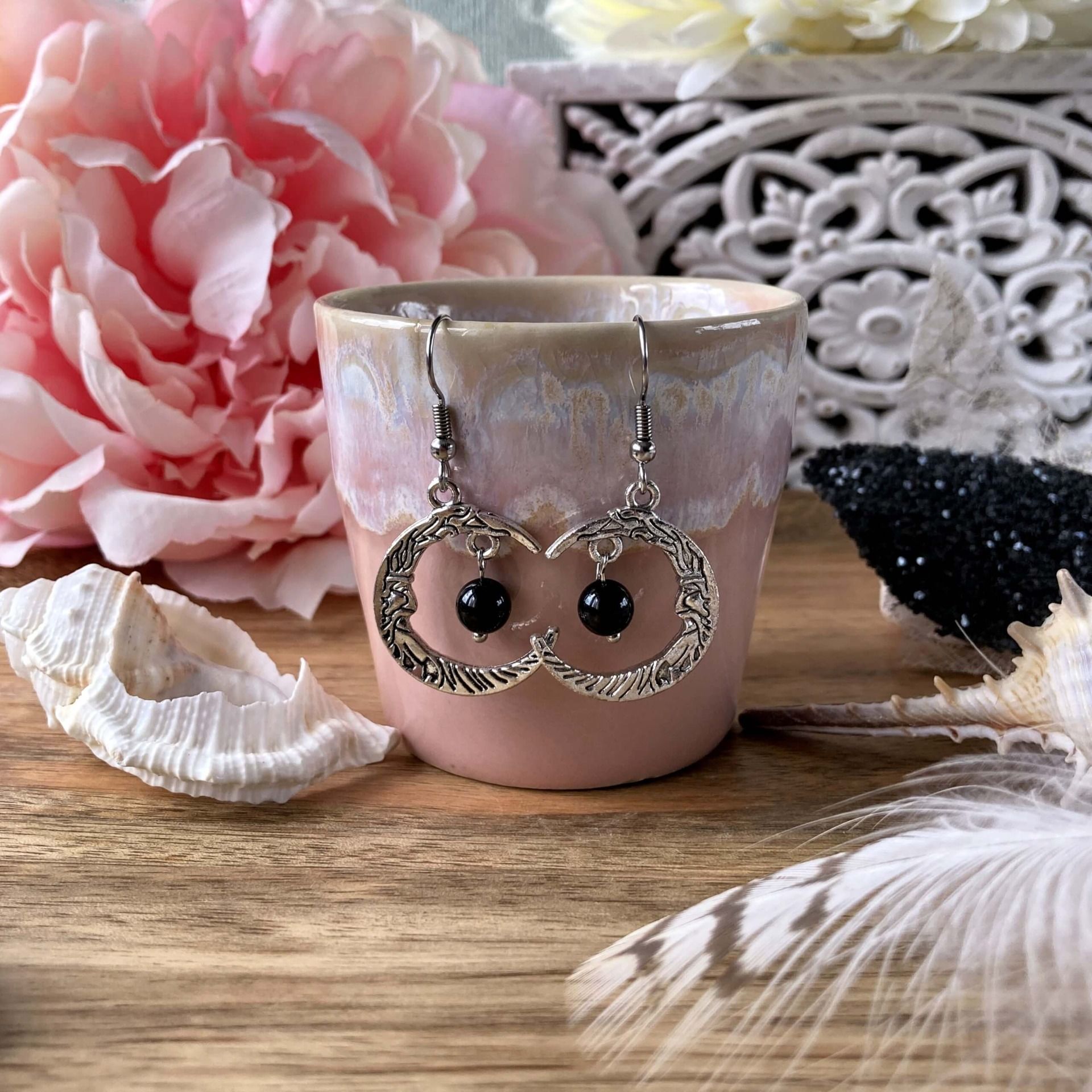 Boucles d’oreilles Lune ou Lune Chat, Obsidienne Noire