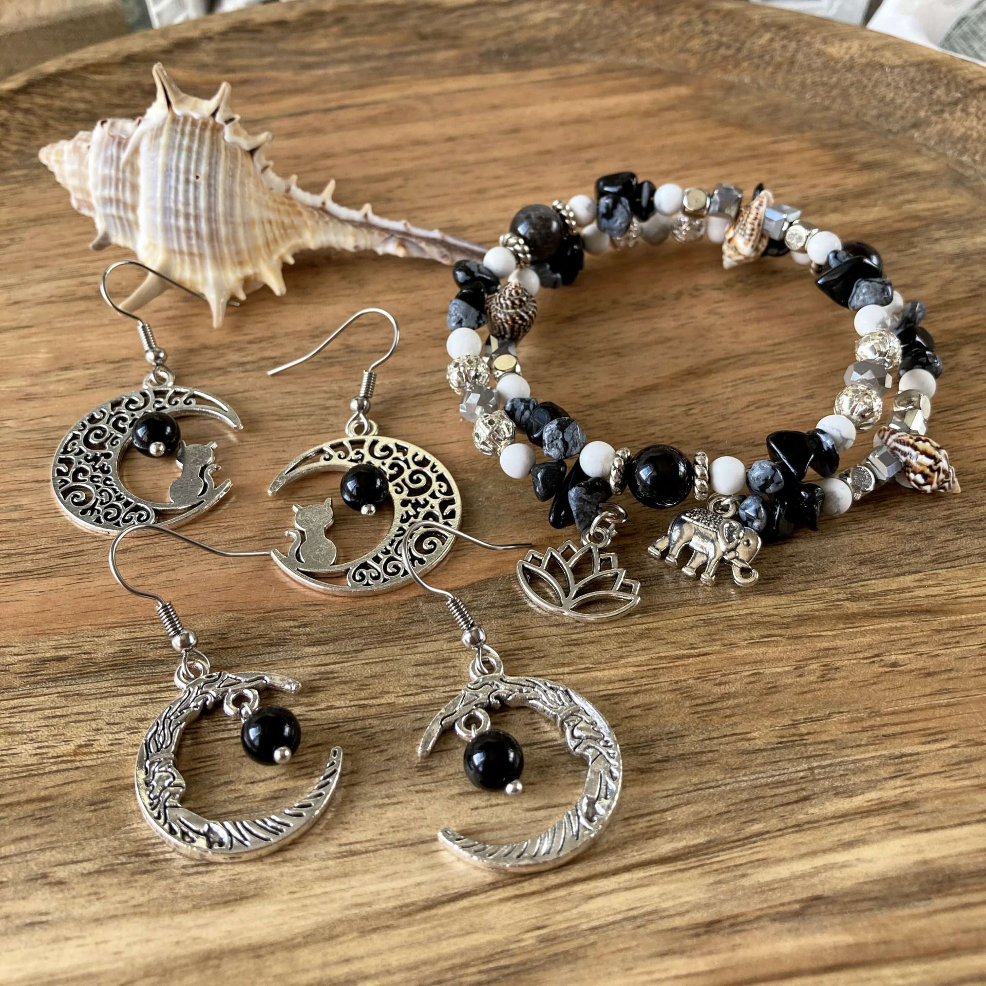 Les boucles d’oreilles lune et chat en obsidienne noire sont un cadeau chargé de symboles. Elles conviennent aussi bien à une femme au style affirmé qu’à une âme rêveuse en quête d’équilibre.
