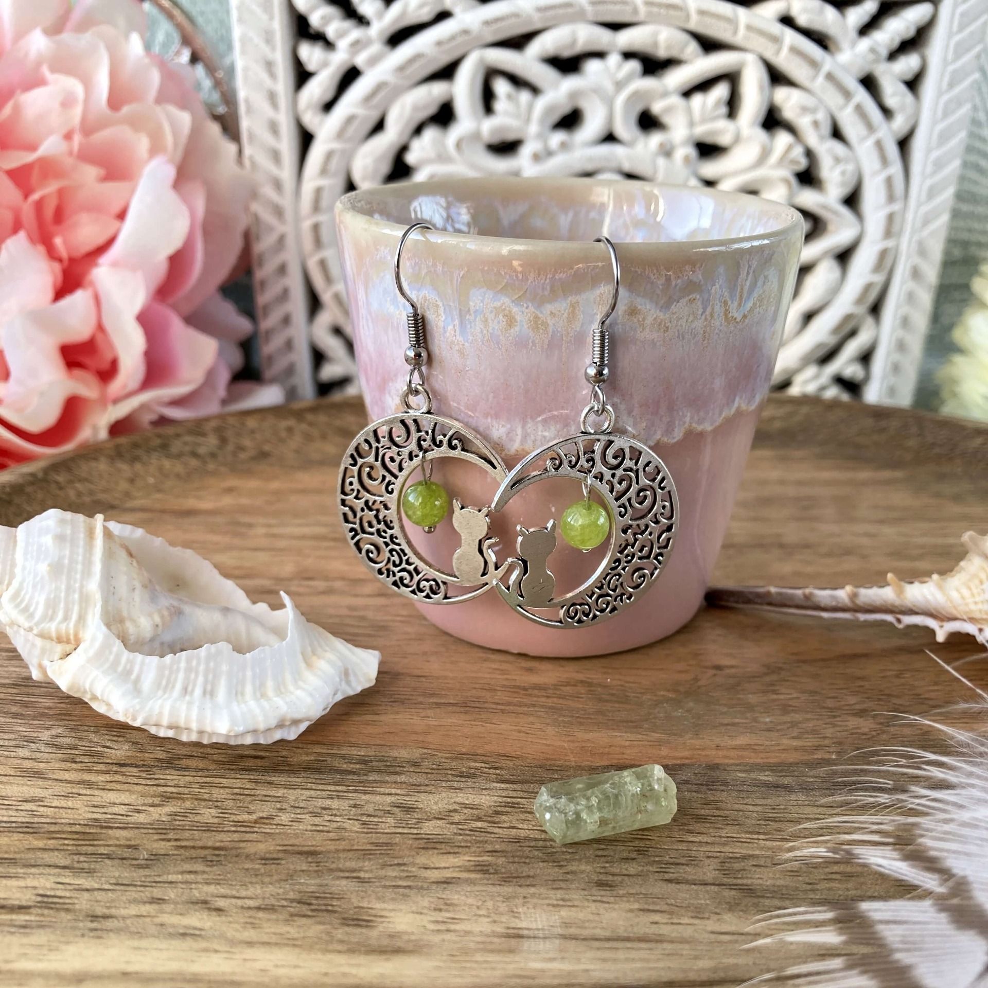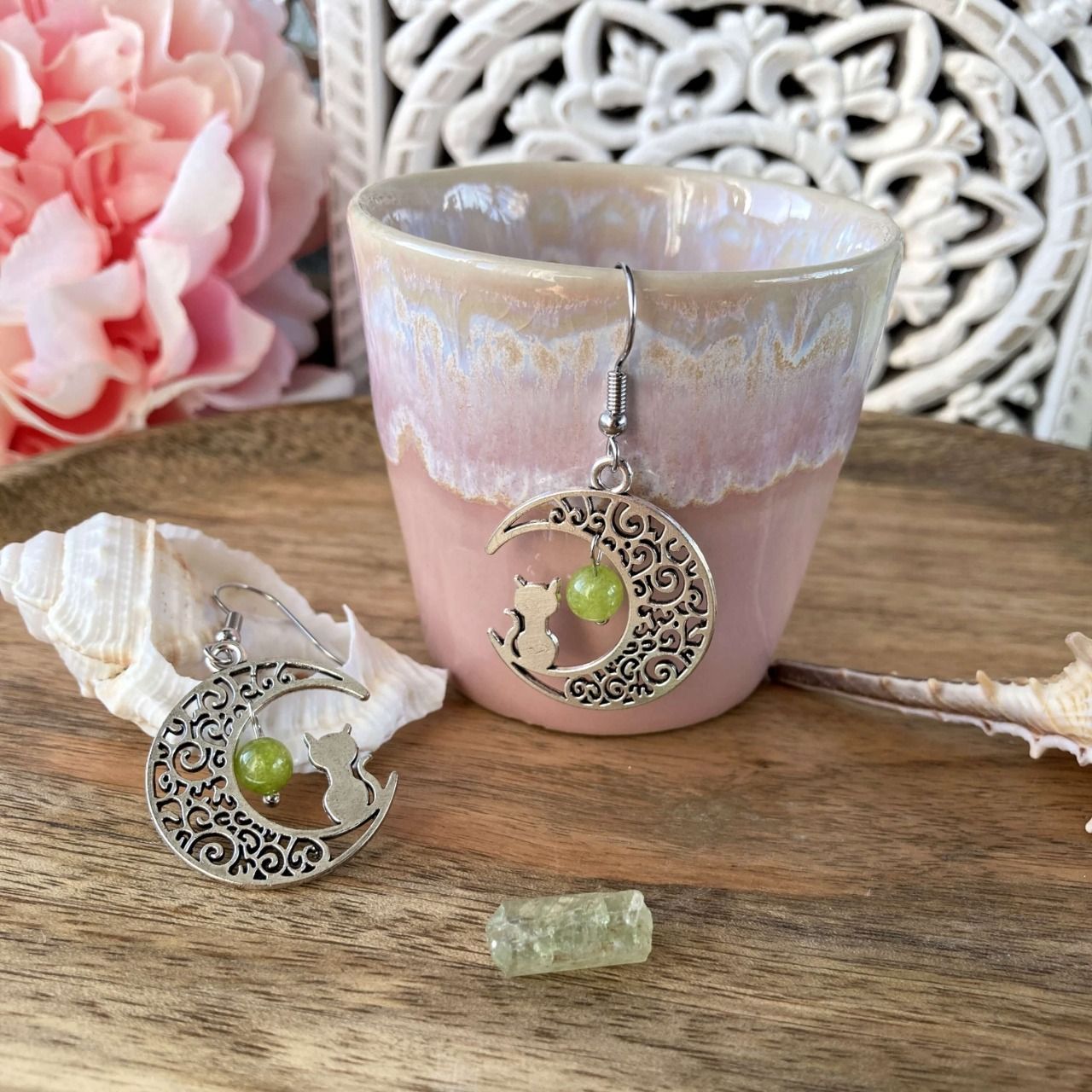 Les boucles d’oreilles lune et chat en péridot sont une très belle idée de cadeau pour celles qui aiment les pierres fines, naturelles et pleines de sens.