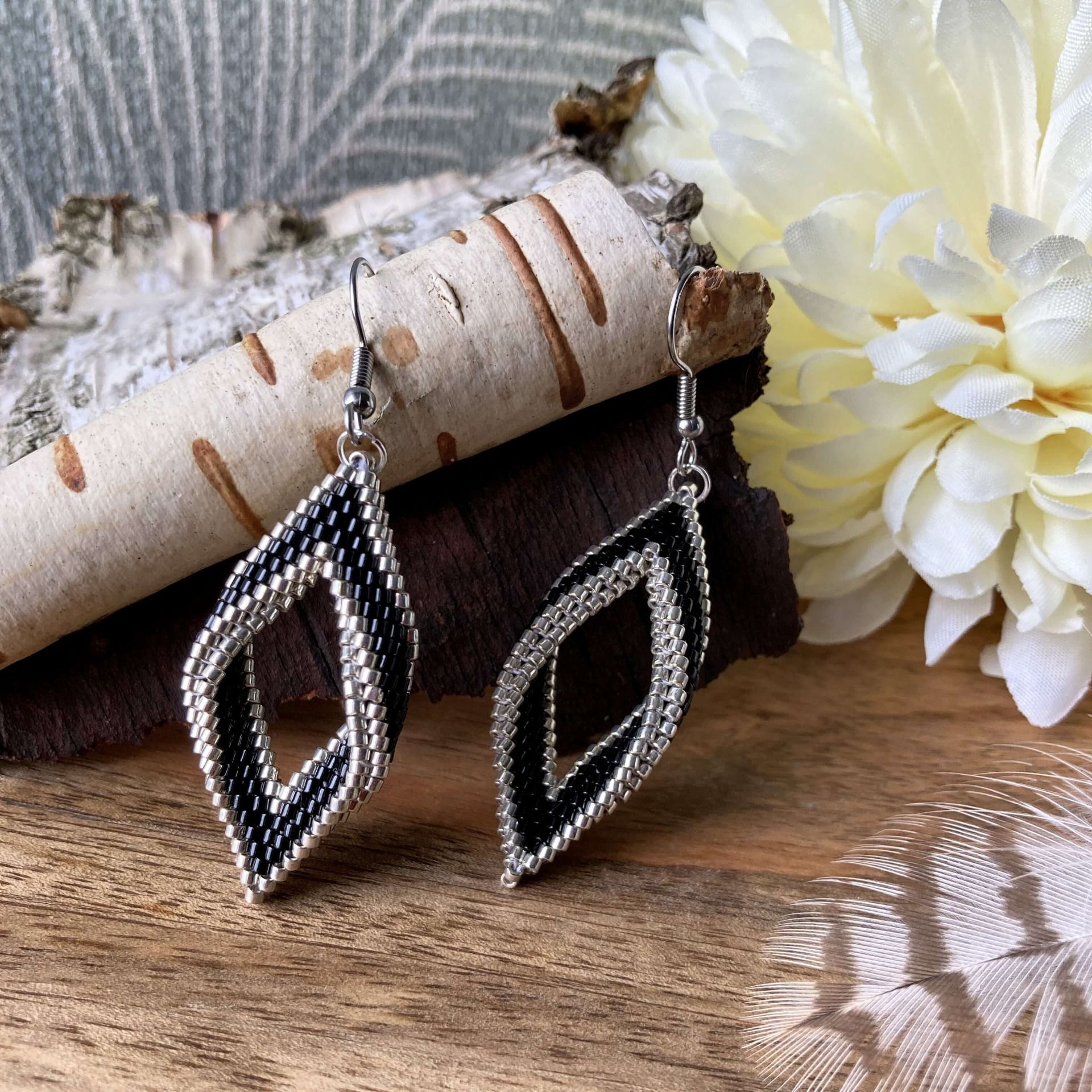 Caractéristiques de la paire de boucles d’oreilles en perles Miyuki Delicas en forme de feuille noires et argent :