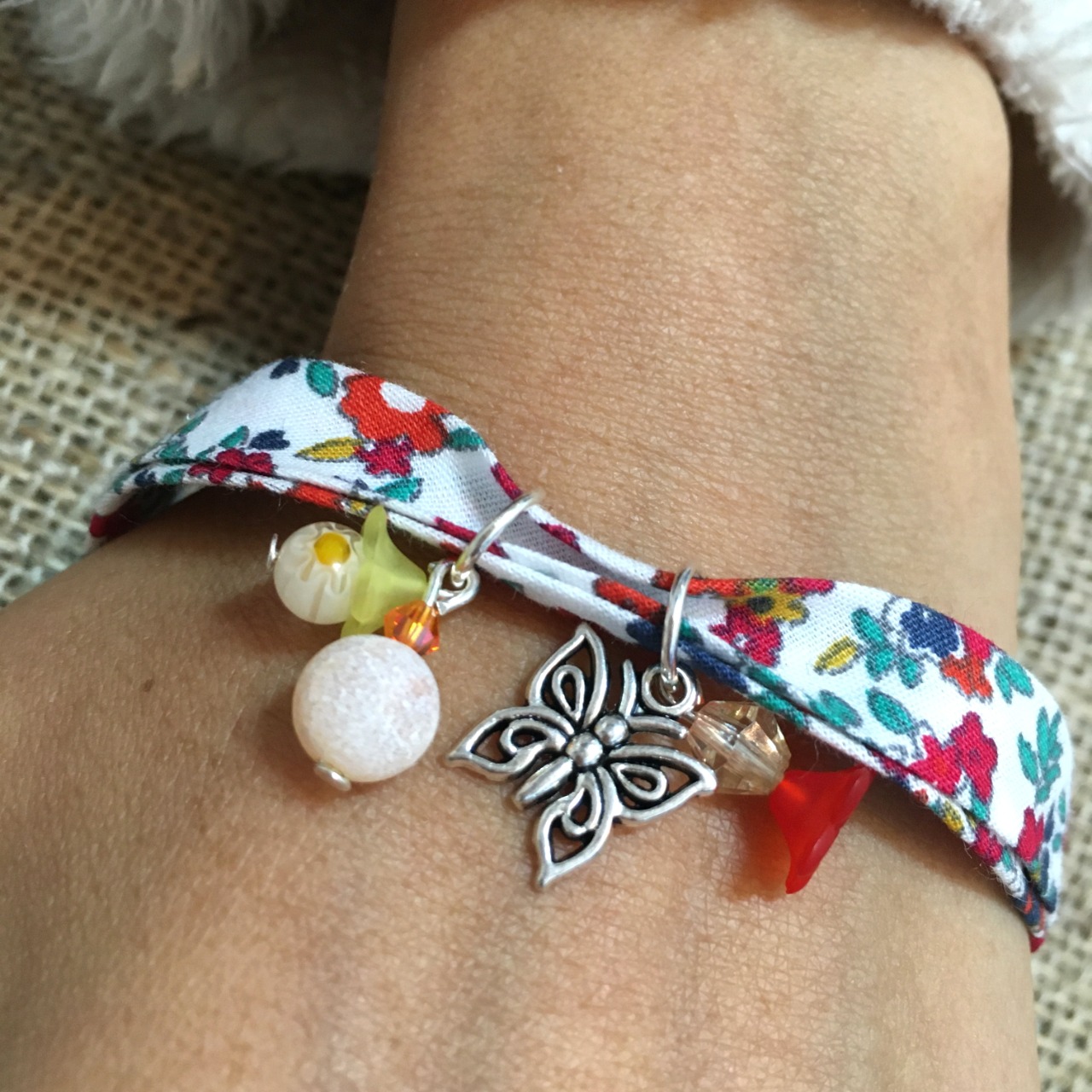 Bracelet 16cm, ruban fleuri blanc et multicolore, papillon