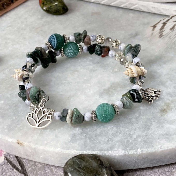 Description Bracelet Jonc en Agate Verte Mousse, perles, coquillages, breloques lotus & éléphant :