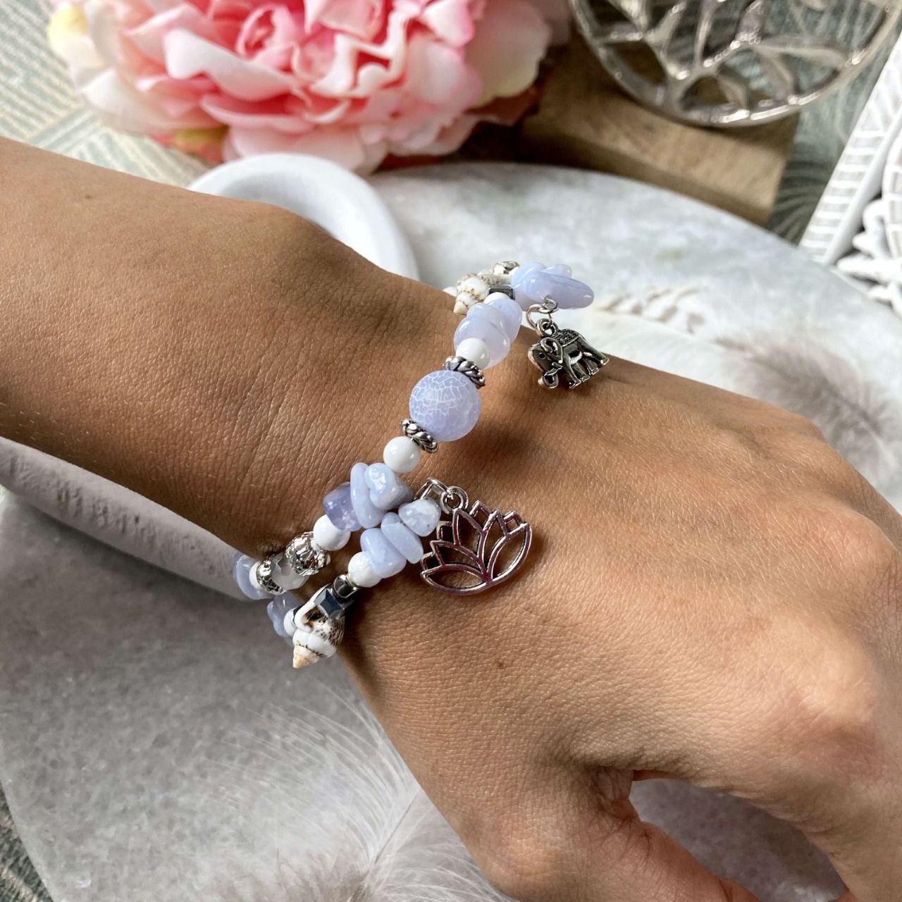 Bracelet Jonc en Calcédoine bleue, perles, coquillages, breloques lotus & éléphant :