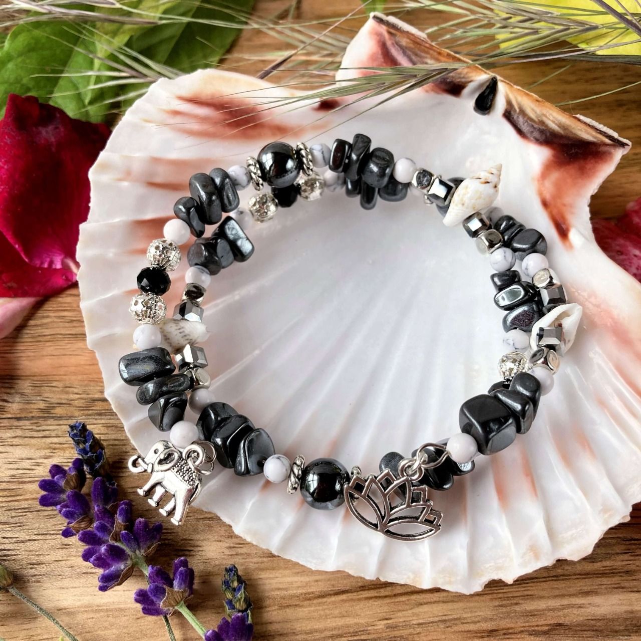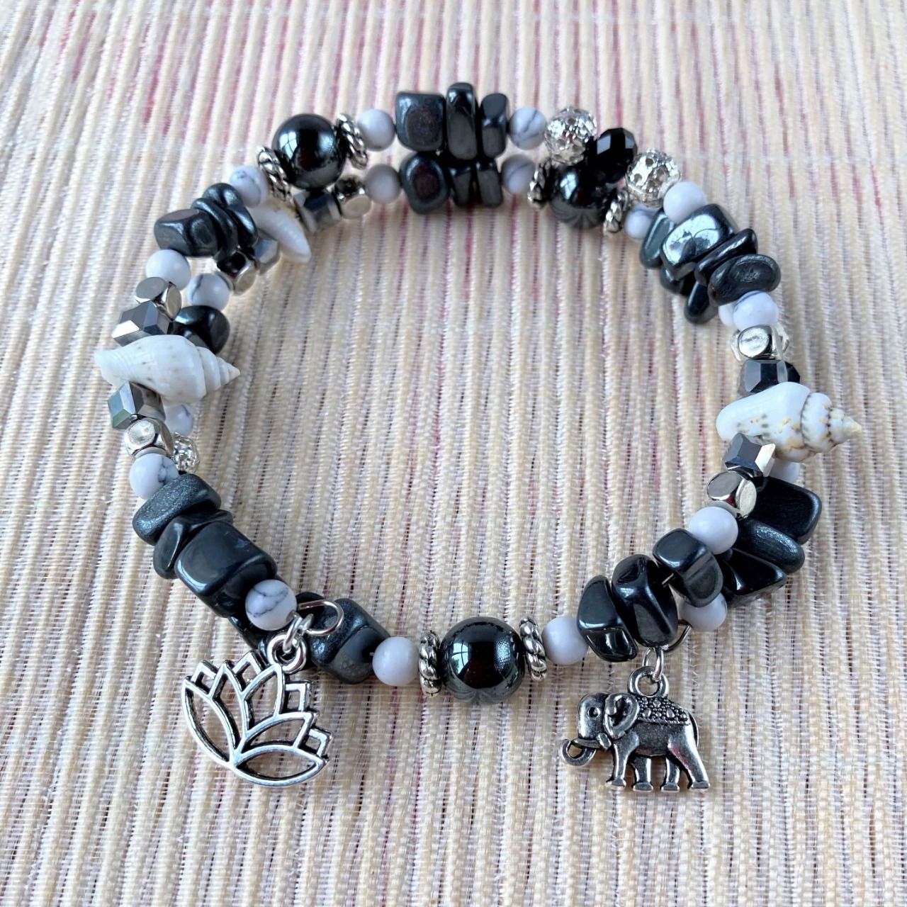 Bracelet Jonc en Hématite, perles, coquillages, breloques lotus & éléphant