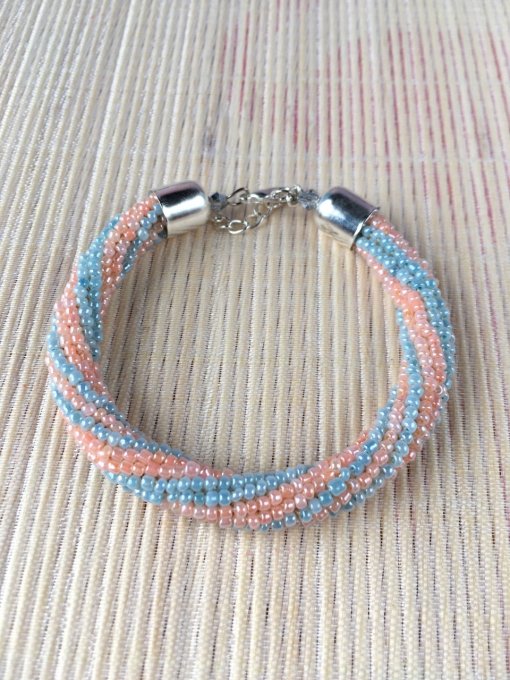 Bracelet rocailles bleu ciel et saumon, torsade russe