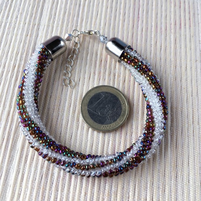 Bracelet réalisé entièrement à la main par mes soins, avec la technique de la spirale au crochet. Le bracelet est composé de petites perles de rocailles translucides blanches et violines irisées à reflets violets, roses, dorés, bleus, verts.