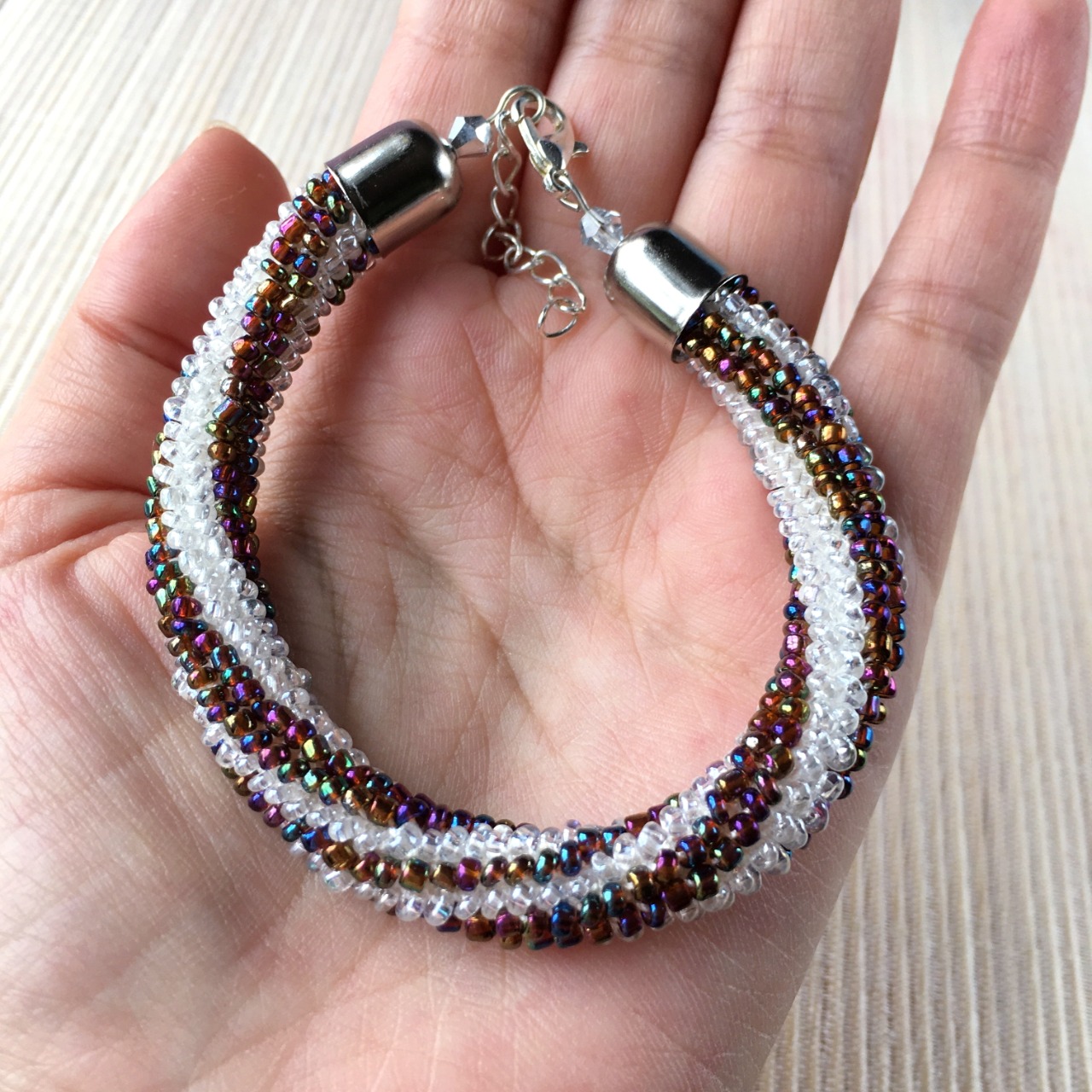 Ce type de bracelet est très agréable à porter, en effet les perles de rocailles sont faites de verre lisse, donc tout doux sur la peau. De plus, il ne pèse que quelques grammes et pourtant vous aurez à votre poignet un bracelet en 3D. Cette forme tubulaire n’est pas très répandue dans les bijoux en perles de rocailles.