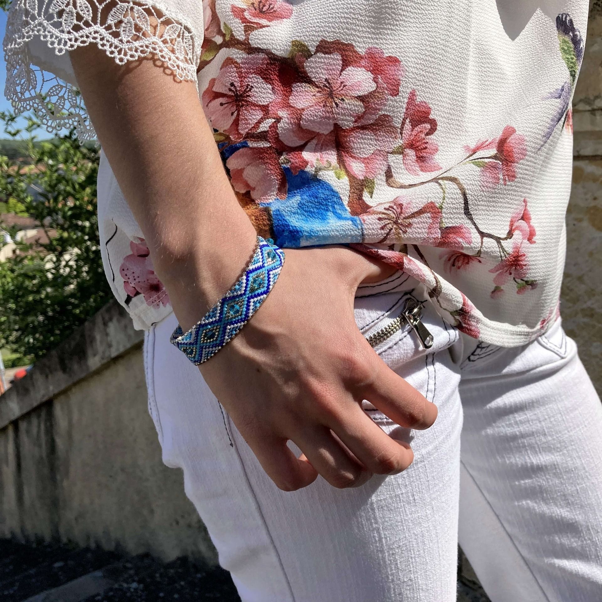 Pour ce bracelet j’ai utilisé un camaïeu de bleus. Au centre j’y ai inséré des toupies en verre d’un joli bleu lagon. Lors du tissage, il faut contourner les toupies, c’est ce changement de trajectoire qui permet d’obtenir ce motif en zigzag.