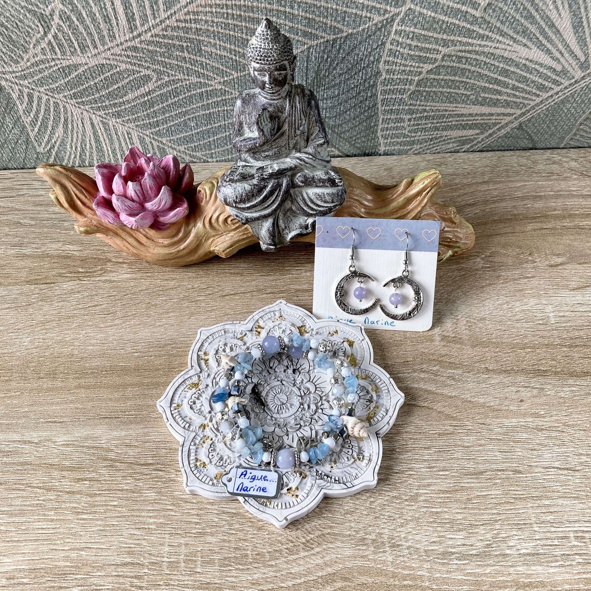 Parce qu’un cadeau doit avant tout transmettre une émotion, j’ai imaginé ce coffret comme une bulle de délicatesse. Il réunit trois créations artisanales faites à la main : une coupelle en Jesmonite, un bracelet jonc en pierres naturelles et une paire de boucles d’oreilles lune ou lune-chat assortie. Trois pièces qui se complètent à merveille pour créer un ensemble raffiné, féminin et empreint de sens.