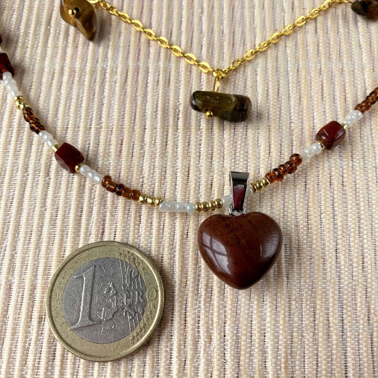 Caractéristiques du Collier double rang Jaspe et Œil de Tigre, pendentif cœur :
