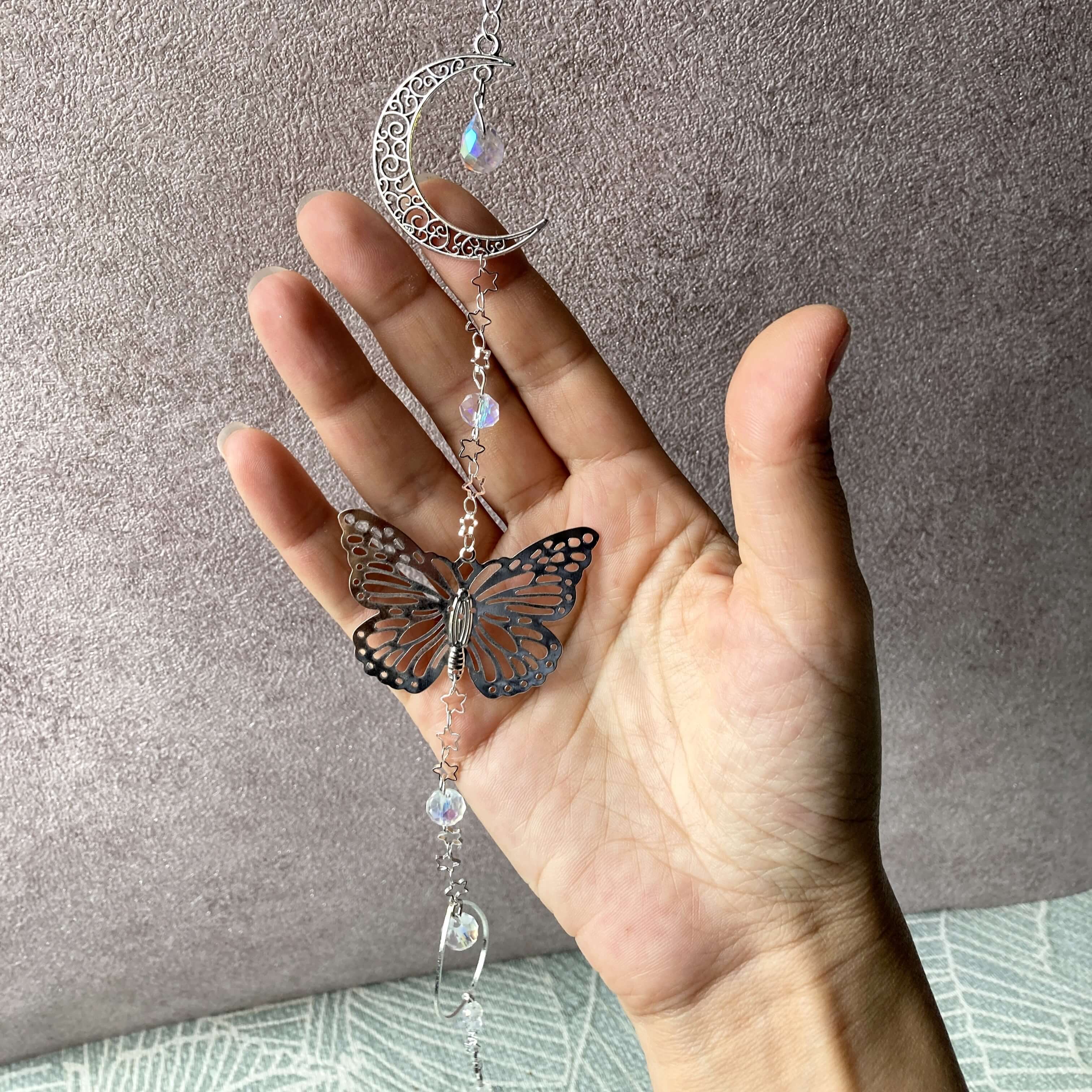 Pour tout achat de plus de 50€, vous recevrez un attrape soleil. Cette année, j'ai souhaité vous offrir un cadeau qui plairait à tous, petit comme grand, homme ou femme. Un cadeau pour décorer votre chez vous et faire briller votre intérieur toute l'année. Un cadeau que j'ai fait à la main, en associant de jolis petits sujets (lune et papillon) à de grosses perles à facettes en verre. Ce sont ces facettes qui accrochent le soleil et qui feront plein d'éclats de lumière dans votre pièce. Pour vous en servir, il vous suffit de l'accrocher à une fenêtre qui prend le soleil direct. Ainsi, quand les rayons toucheront les perles, vous aurez des reflets dans votre intérieur.