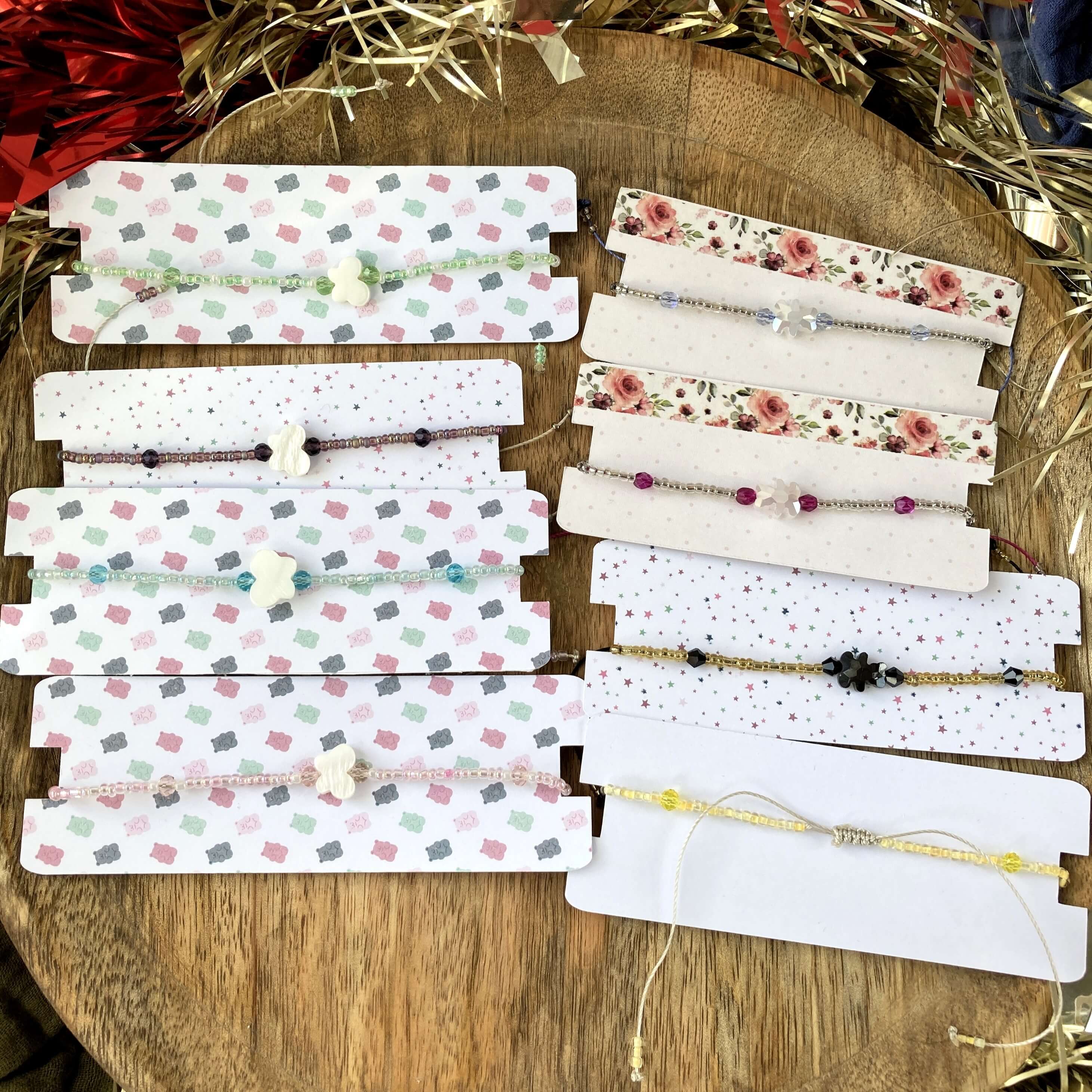 Pour tout achat de plus de 30€ vous recevrez un petit bracelet, que j’ai fait moi-même à la main. Il y a 2 types de bracelets : les bracelets ourson (bleu, rose ou noir, réglables) et les bracelets papillon (rose, bleu, jaune, vert, réglables). Merci de mettre dans la zone commentaire ce que vous préférez et dans quelle taille (petit, moyen, grand), mettez plusieurs choix, je ferai en fonction de ça et de ce qu’il me reste en stock.