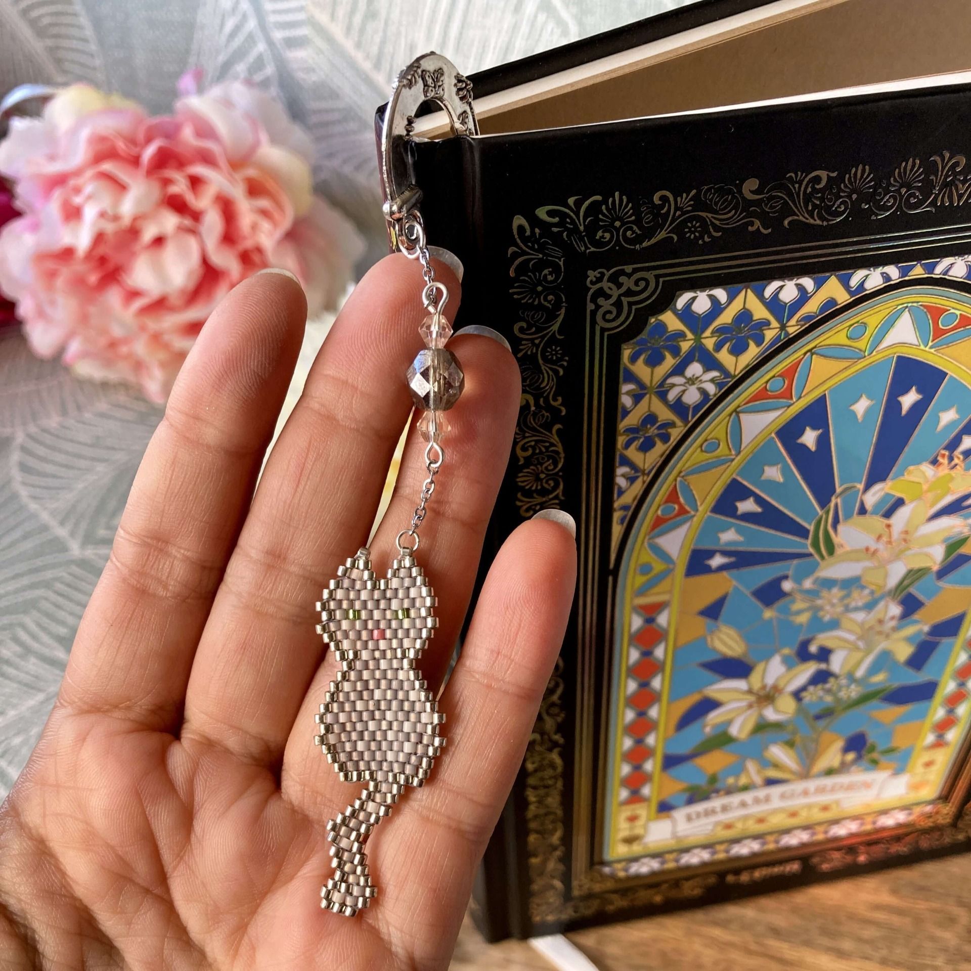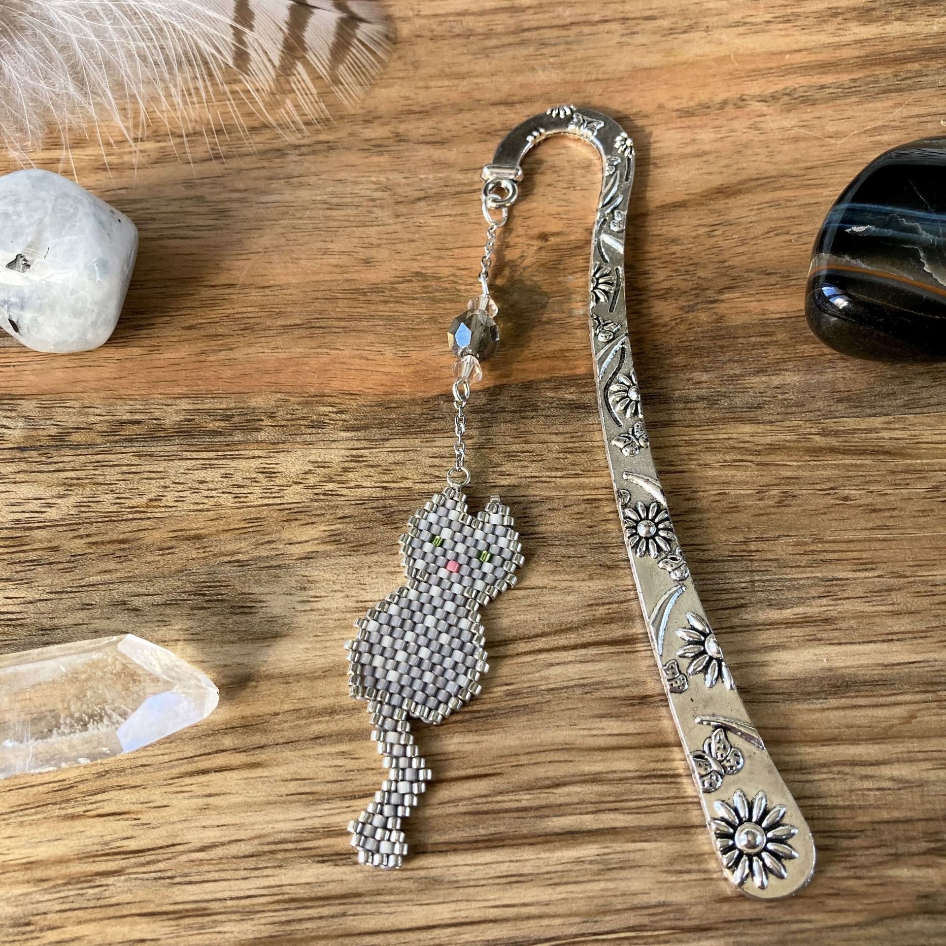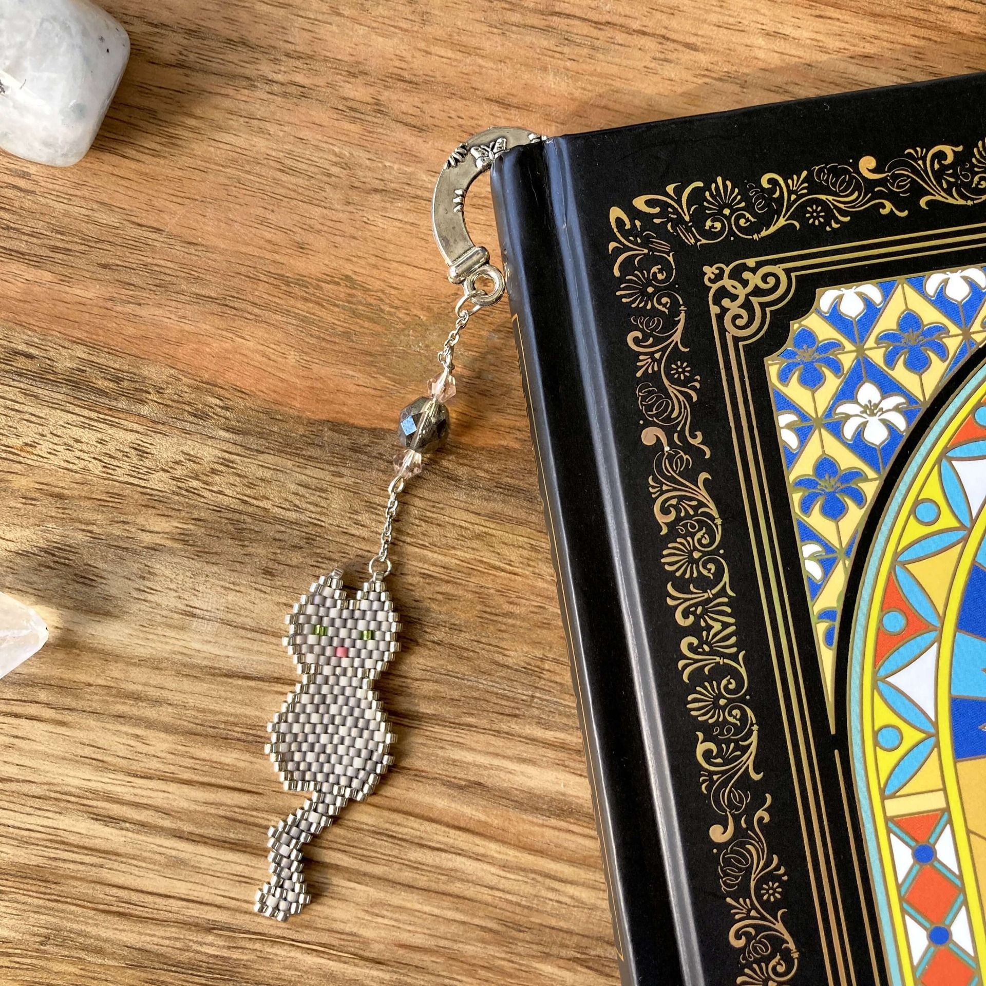 Ce Marque page chat gris en perles Miyuki est un modèle limité : il n’y en a que quelques'uns comme celui-ci dans la boutique. Il existe plusieurs variantes de cet accessoire, avec d’autres couleurs et motifs.