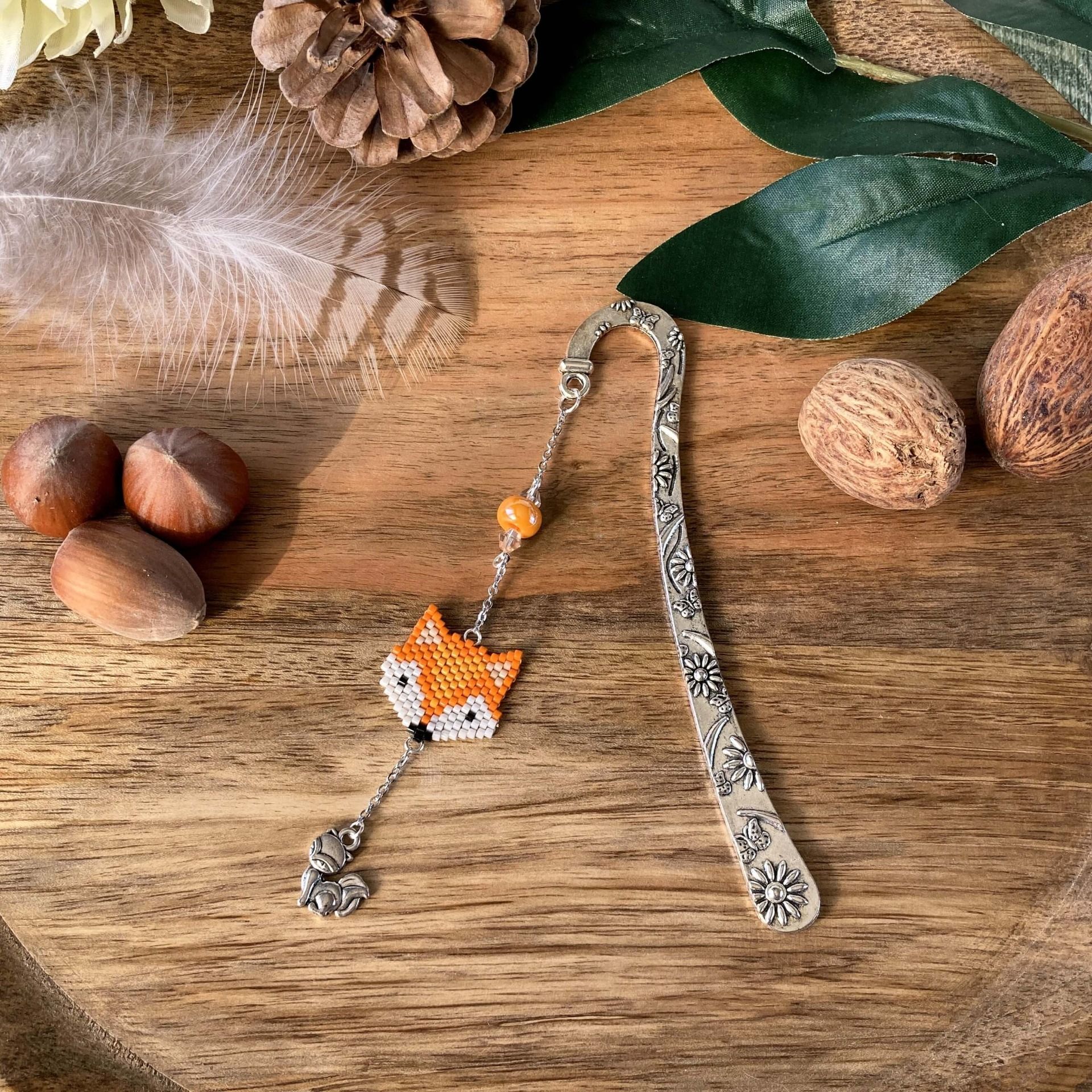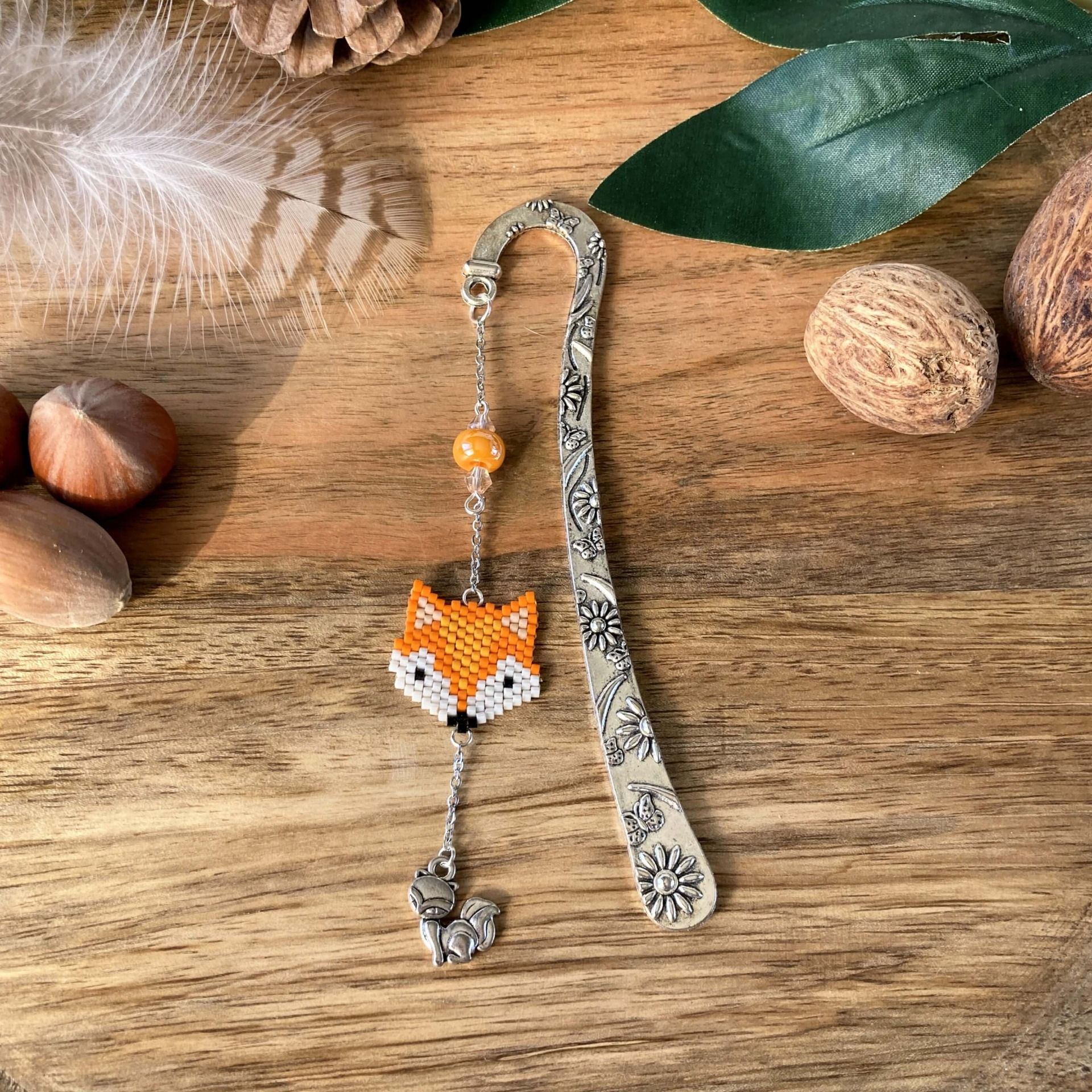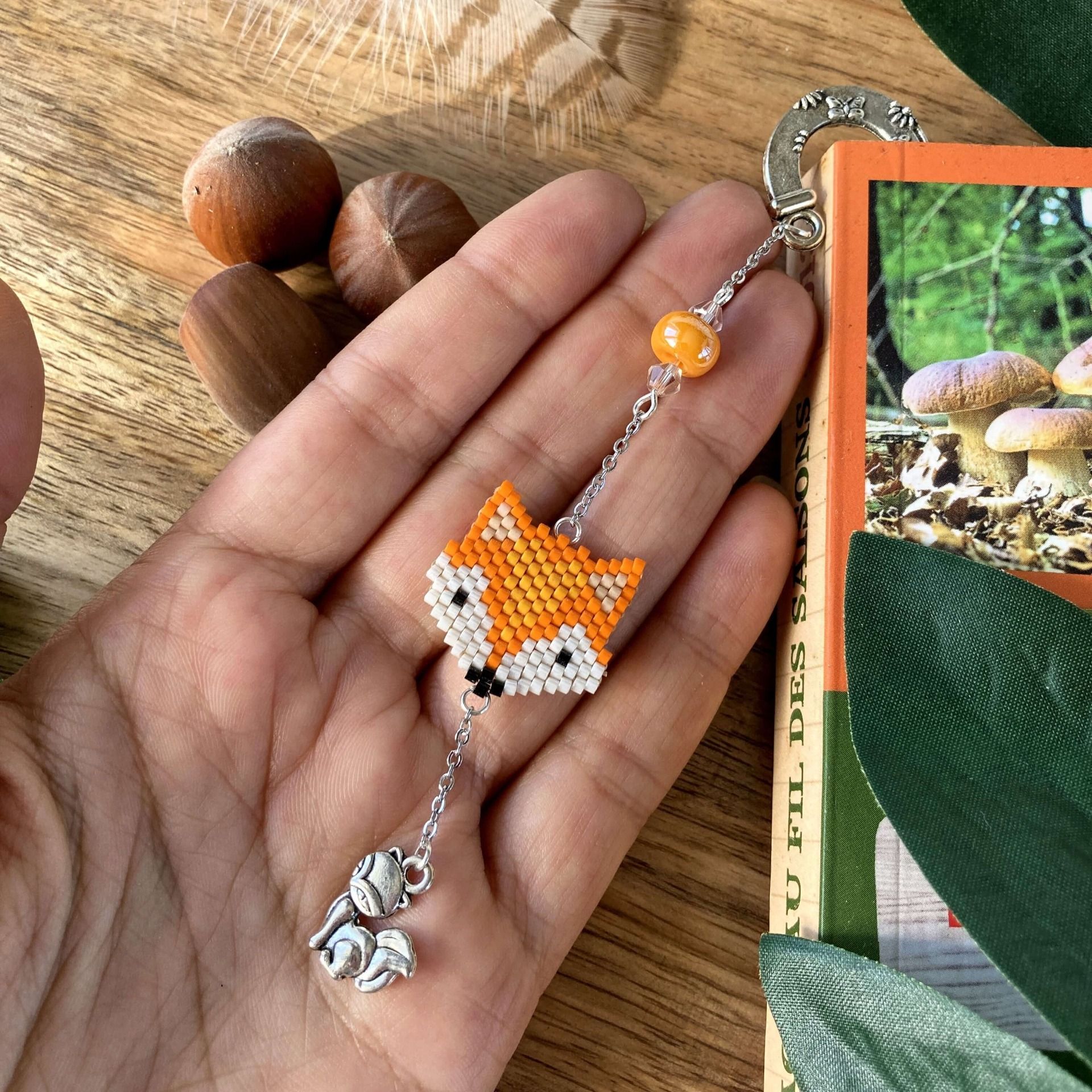 Je travaille chaque modèle à la main et je prends le temps de choisir les perles, les couleurs et l’harmonie de l’ensemble. Le renard est tissé en perles Miyuki, connues pour leur finesse et leur régularité. Cela permet d’obtenir un rendu propre, net et très détaillé. Le petit renard affiche une jolie tête espiègle. Sa couleur vive ressort parfaitement et apporte un côté chaleureux à l’ensemble. C’est un petit compagnon qui veille sur votre page pendant que vous faites une pause.