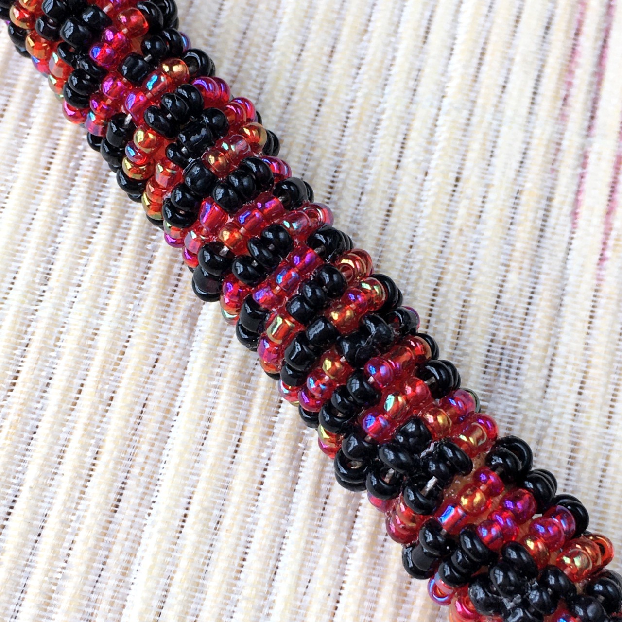 Pique à cheveux, bambou et perles de rocailles, rouge & noir